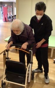 利用当初は車椅子を使用されていましたがこのように現在では歩行器で移動できるまでにレベルが上がっています。これはご本人様の日々のリハビリ成果です!!!