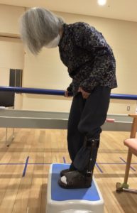 ご自身で「いち・に・いち・に」と掛け声をかけられながら行われています。左側麻痺の方で右足から上り、左足から降りるを繰り返し行われます。休憩をはさみながら行われます。