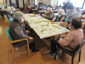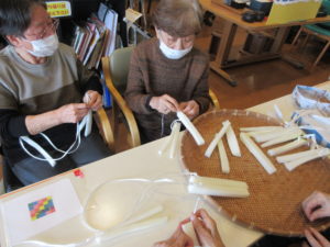 この作業を初めて行う方、経験がある方がおり、初めての方にやさしく「こうやって紐をとおしていくとよ~」と教えながら和気あいあいと作業を進めておられました。