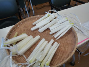別のご利用者様のグループに、大根を棒状に切ったものを紐に通す作業を行って頂きました。
