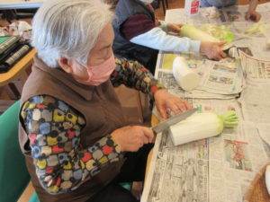 皮をむく人、切る人と分かれて作業が始まりました。手際もよく職員も驚きでした。