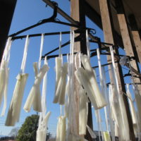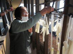 日光がまんべんなく当たる様に紐を交互にずらして、丁寧に干しておられました。