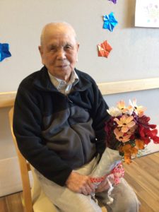 職員から花束や、ユニークに彩った色紙をプレゼントされると、