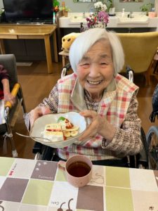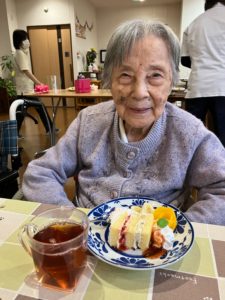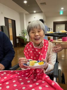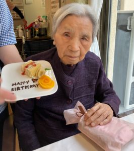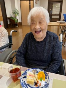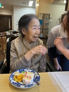 職員・利用者の方からのお祝いの言葉に普段は笑顔が少ない方ですが、