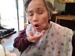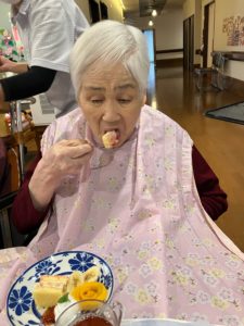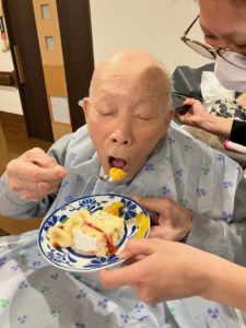 中には「あなたにもあげようか」とスプーンでケーキをすくって、職員へ