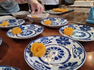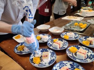 完成したケーキをカットし、お皿に盛りつけていきます。