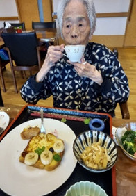 煮物と野菜サラダ、甘未には白玉にあんをのせ黄な粉をかけてみました。