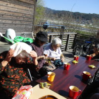今日のレクリエーション活動は、天気が良かったのでウッドデッキで日向ぼっこしました~🌞