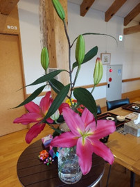 食堂には、大輪の百合オリエンタルが大きく花開きました。