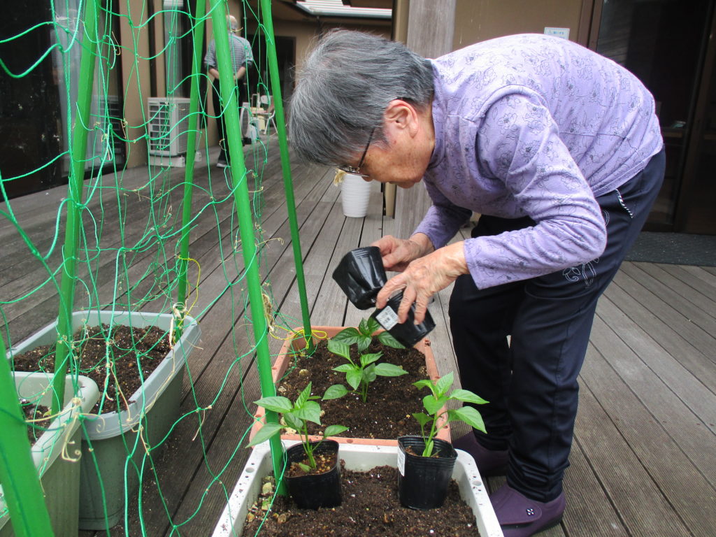 ご利用者様にプランターの土を耕していただき、肥料も混ぜていただきました。