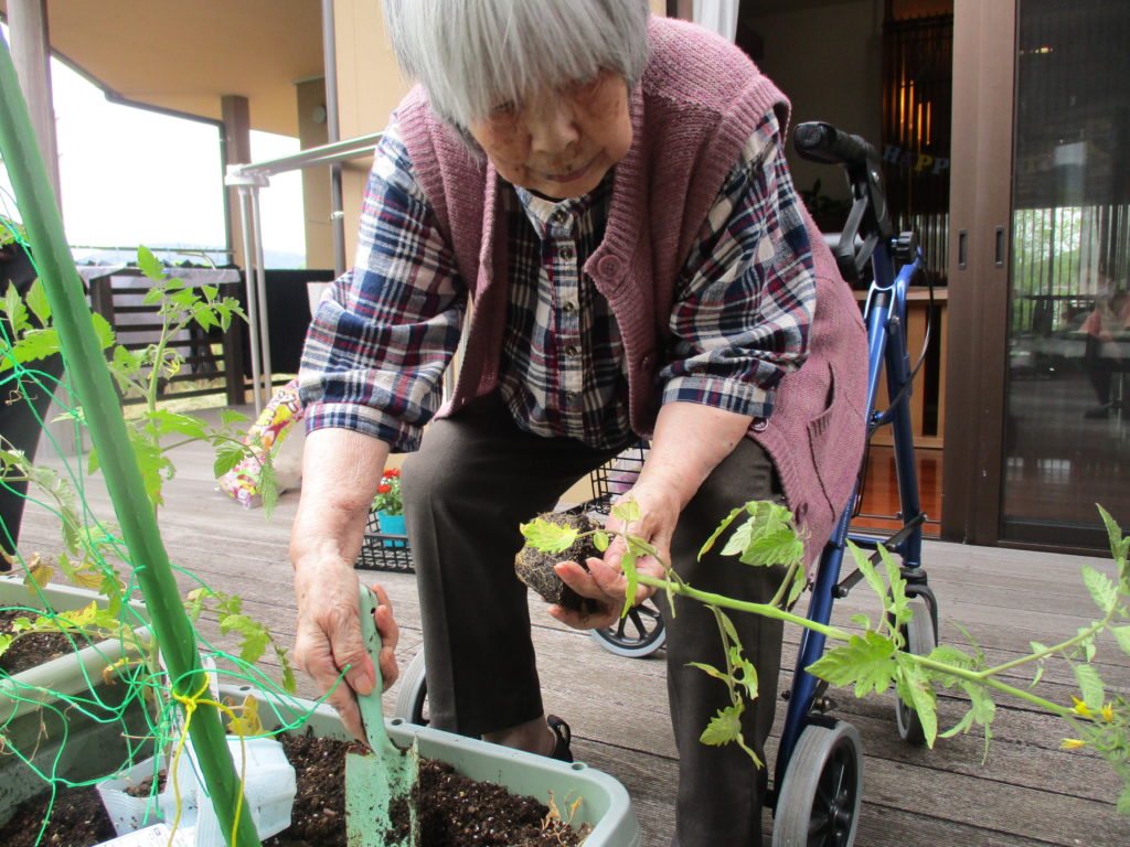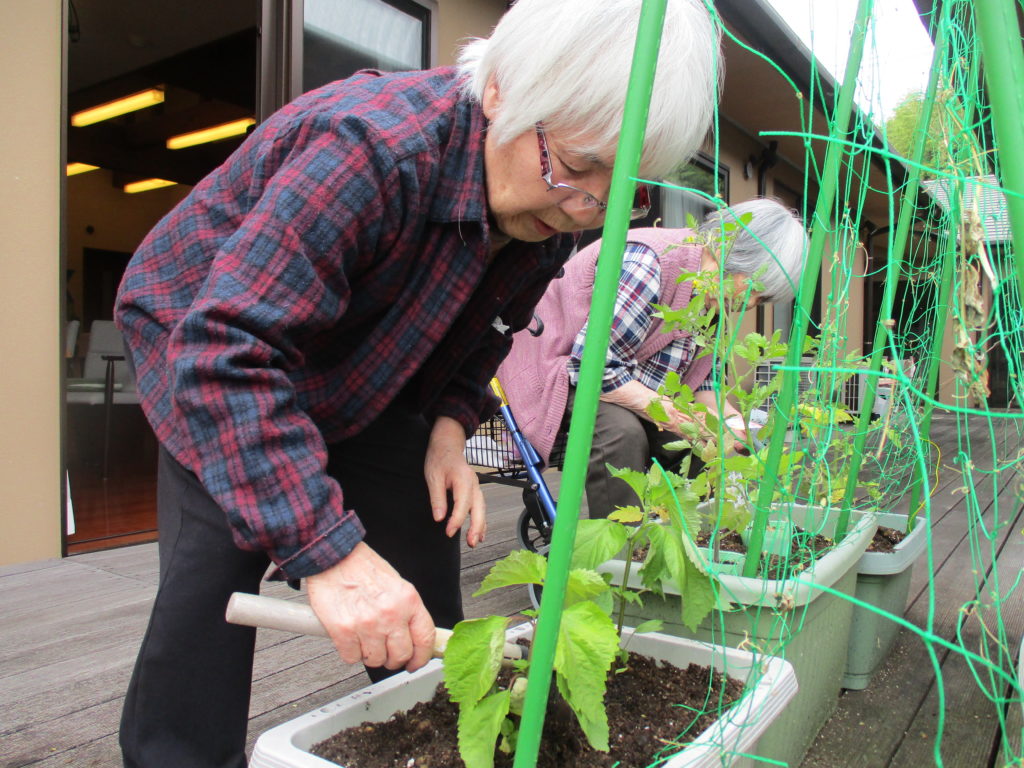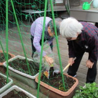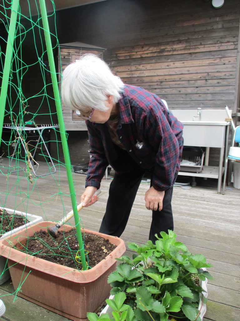 ご利用者様にプランターの土を耕していただき、肥料も混ぜていただきました。