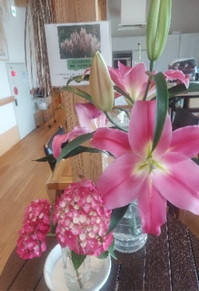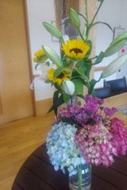 中央居間には、オリエントという大輪の百合の花とひまわりも・・
