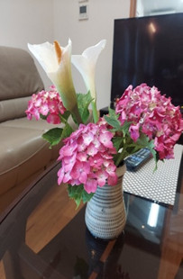 入居者様の家族の庭に咲く、鮮やかな深紅のあじさいとカラー