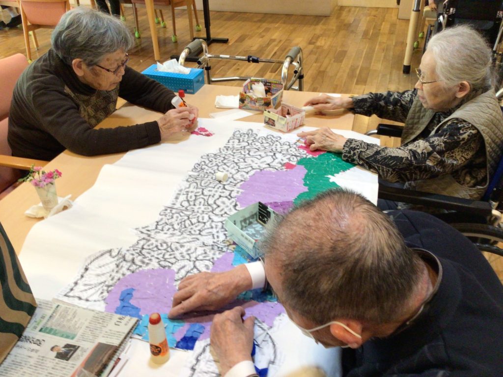 まずは、貼り絵の元となる色紙を一つずつちぎっていき、折り紙が折れる方にはアジサイを作っていただきました!