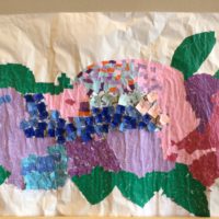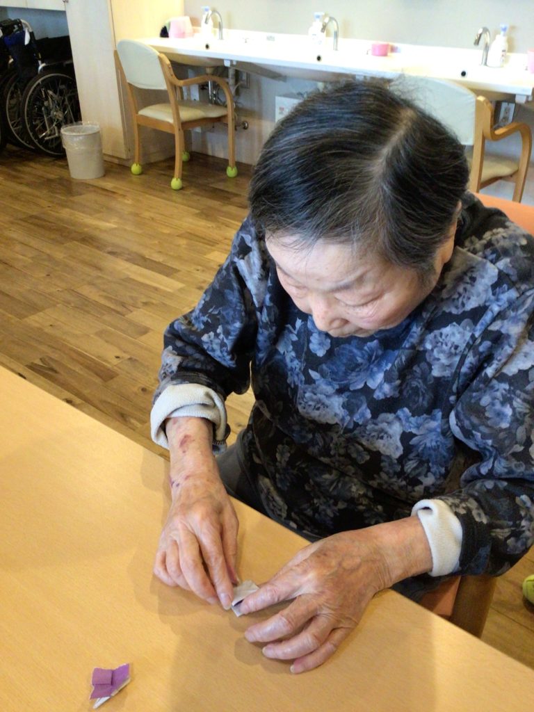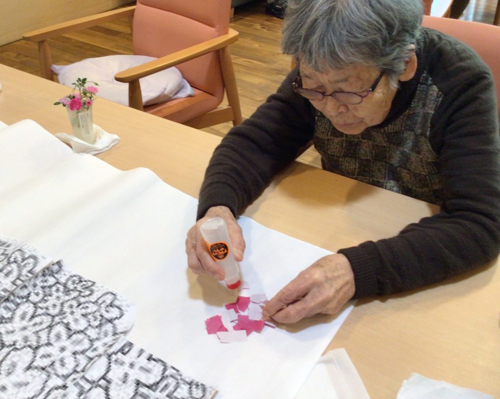 まずは、貼り絵の元となる色紙を一つずつちぎっていき、折り紙が折れる方にはアジサイを作っていただきました!
