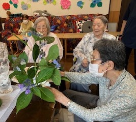 おやつの後は、利用者様がテーブル上のあじさいを見ながら、「剣山はあるね?」と尋ねられ、はさみと一緒にお渡しするとあじさいの