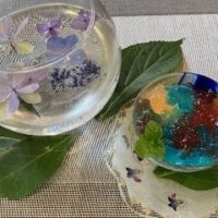 白い牛乳ムースの上に紫色・薄いピンク・水色の3色のゼリーをのせ、あじさいゼリーを作りました。