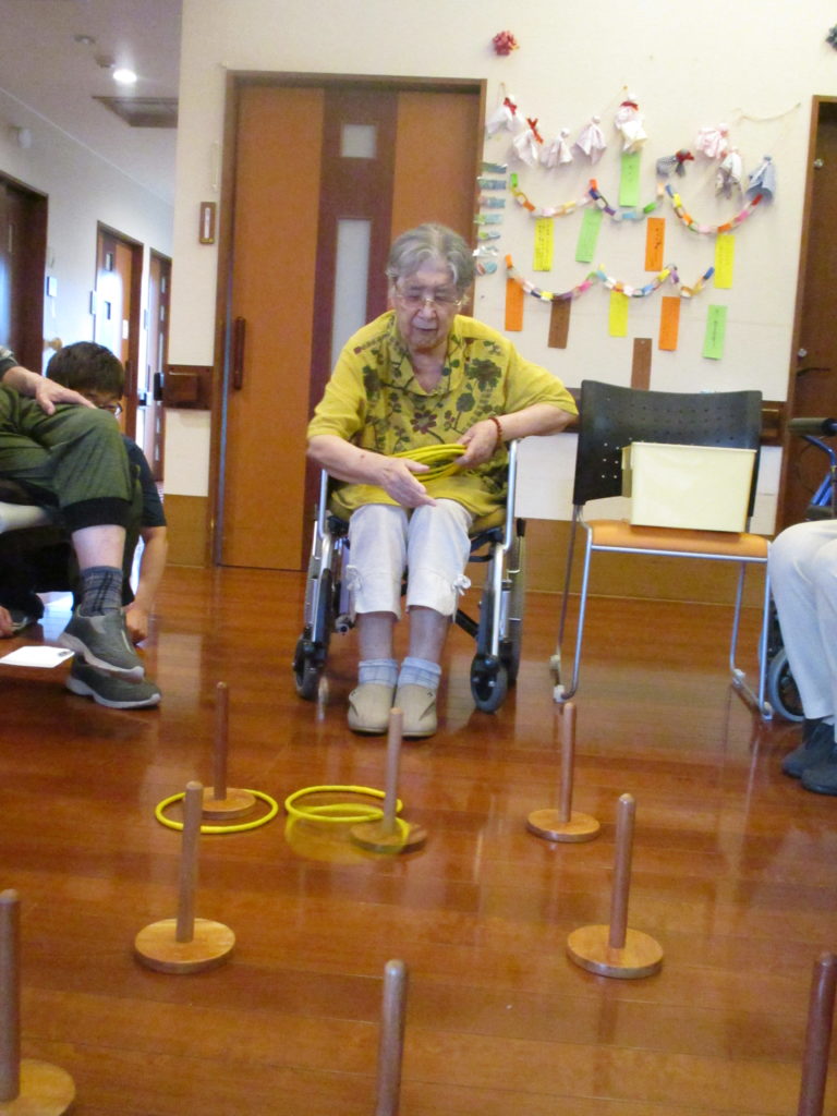 「意外と腕の力が要りますね。」「肩の上がらんよ~」と一生懸命に輪を投げておられました。