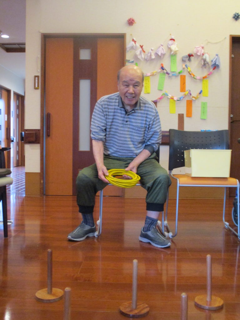 「意外と腕の力が要りますね。」「肩の上がらんよ~」と一生懸命に輪を投げておられました。