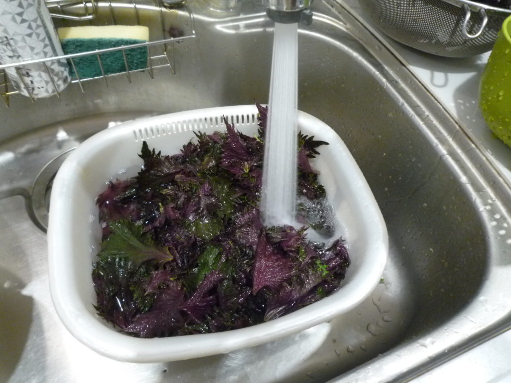 次の工程は紫蘇をきれいな物だけに選別した頂いてたっぷりのお水で洗いました。