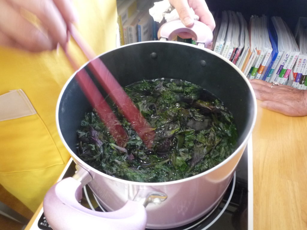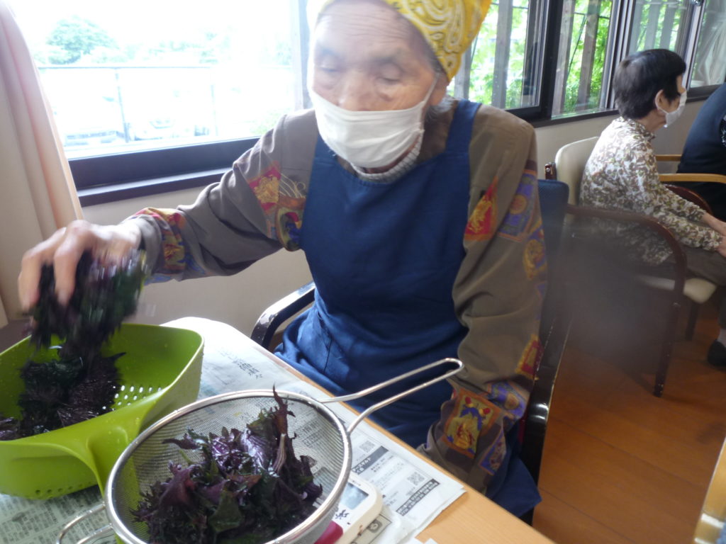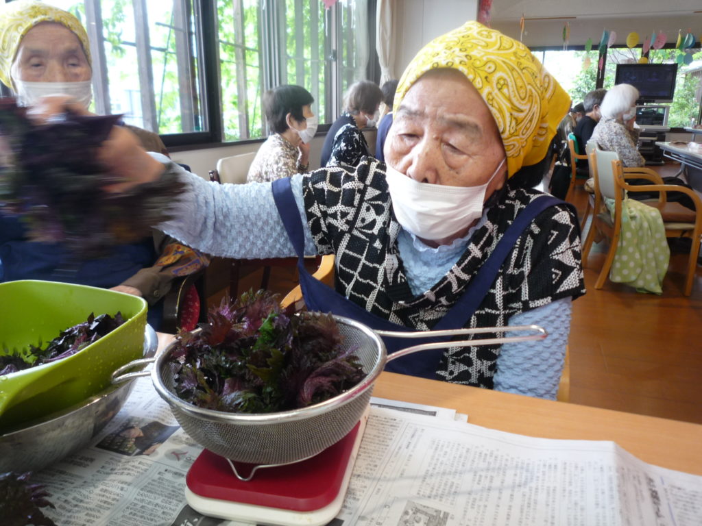 最初の工程では赤紫蘇を手でちぎって頂きました。