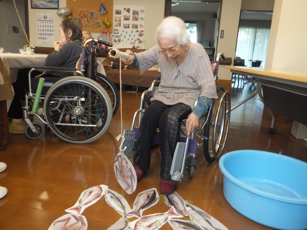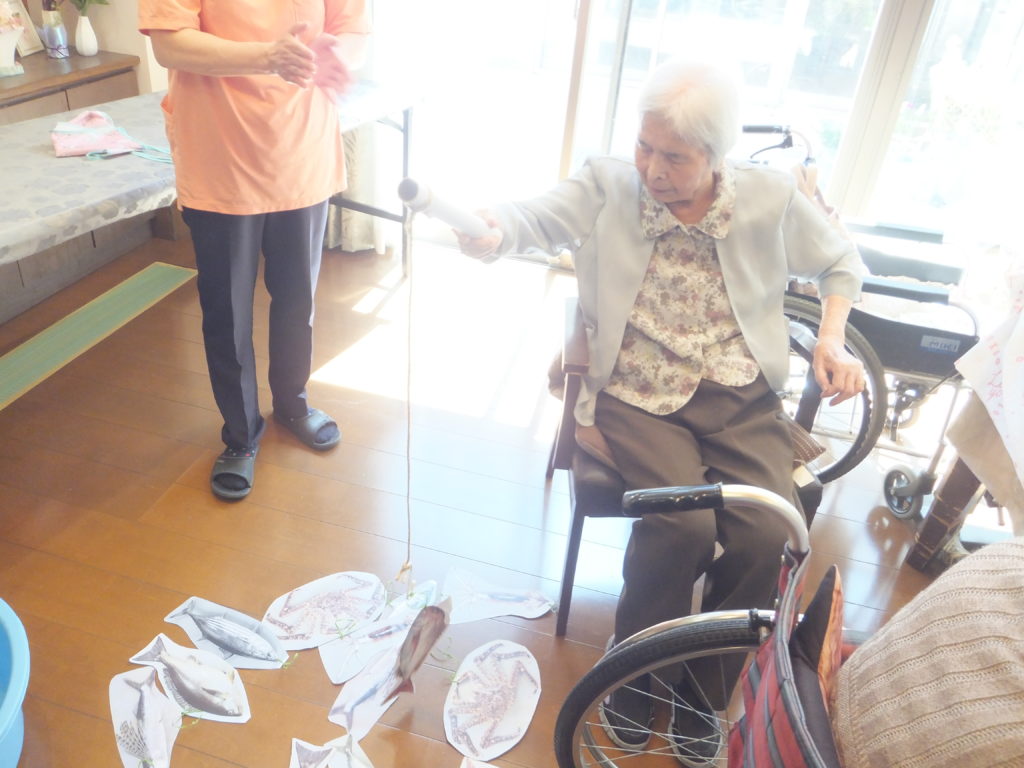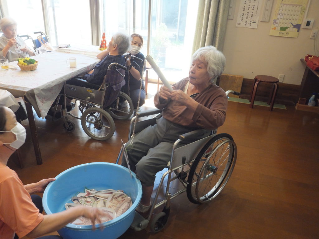 誕生日のお祝いの前に釣りゲームを行いました。今日のおかずを釣り上げるために一所懸命にされていました。