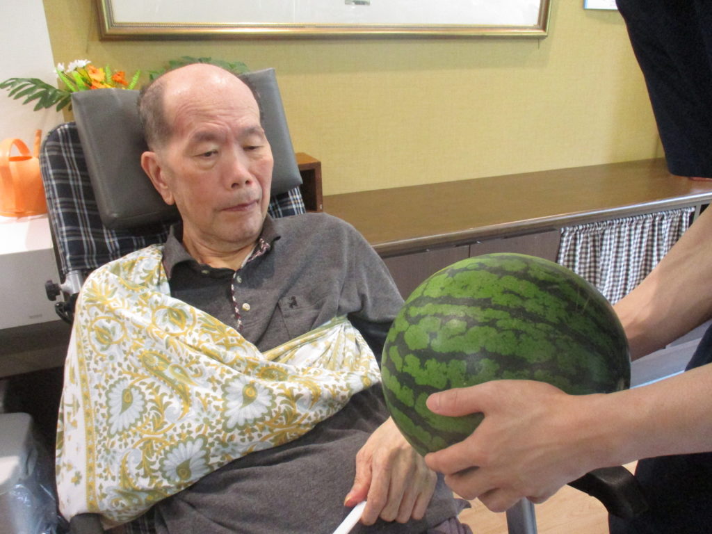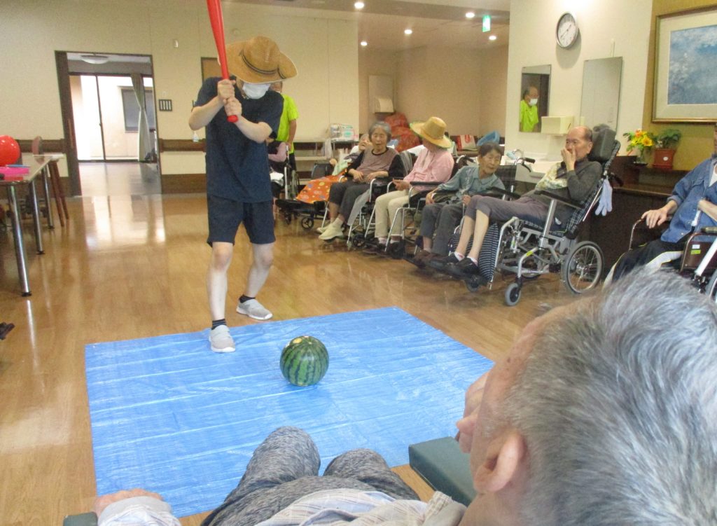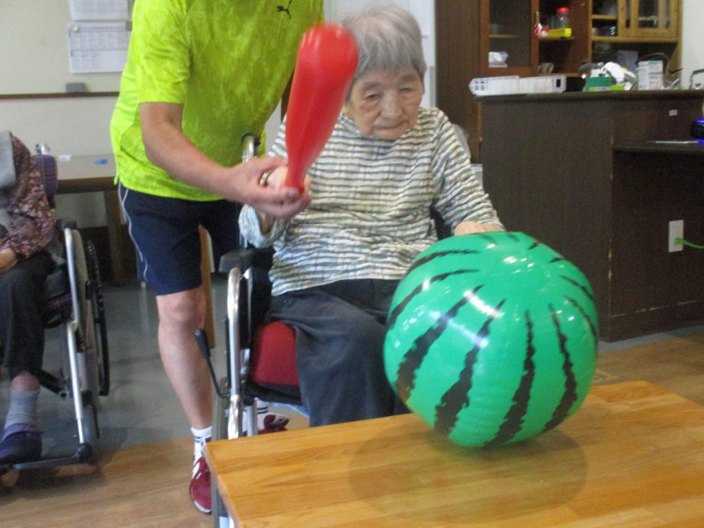 まずは入居者様にビーチボールのスイカで思いっきり叩いてもらいます。