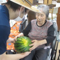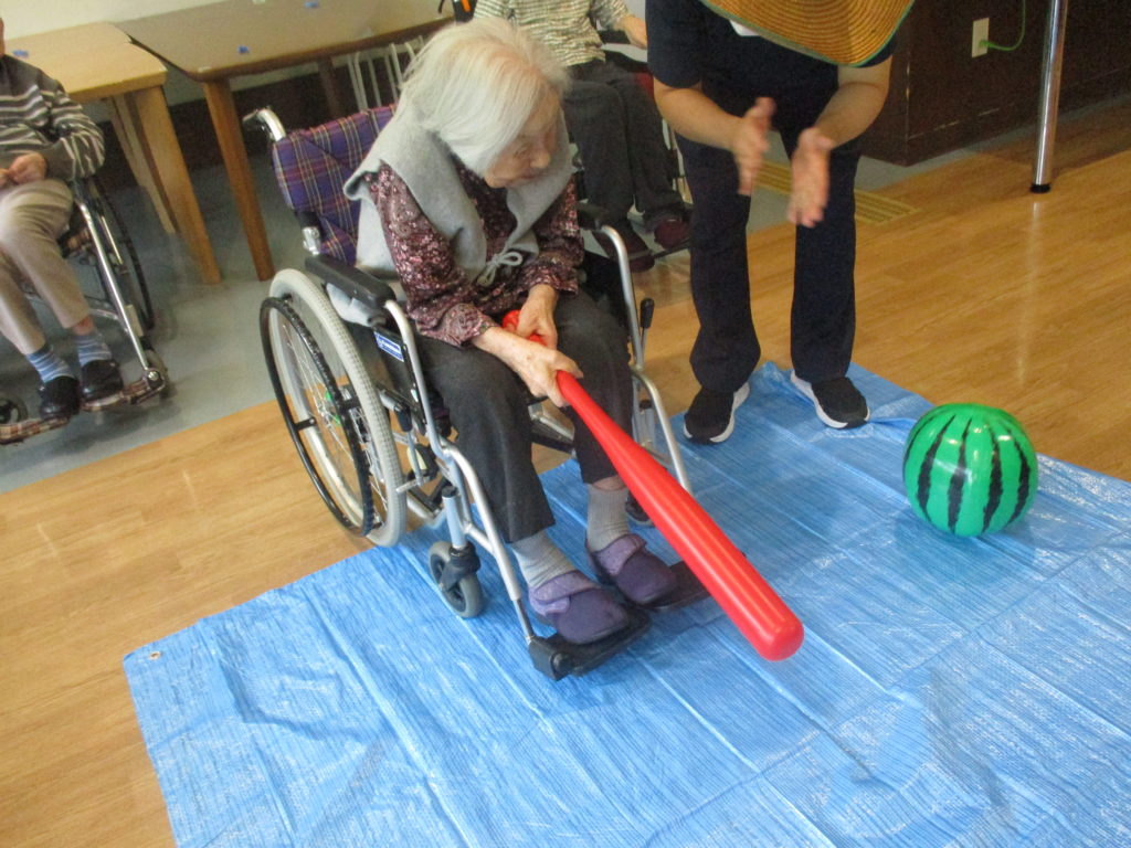 まずは入居者様にビーチボールのスイカで思いっきり叩いてもらいます。