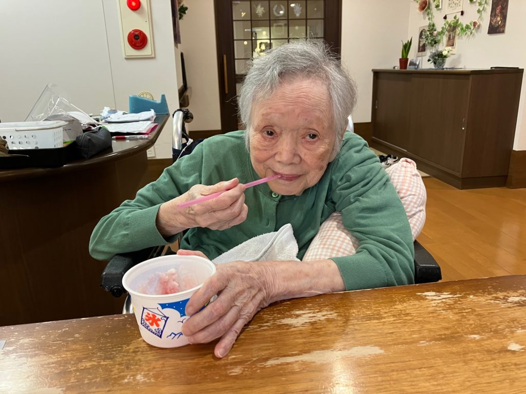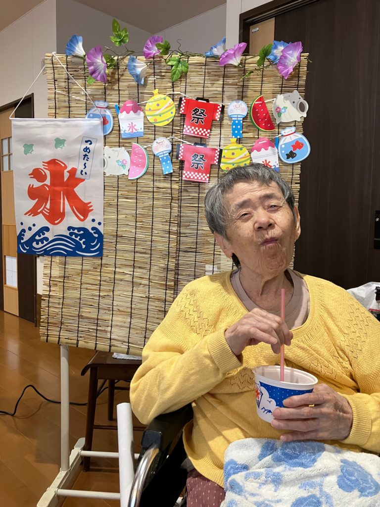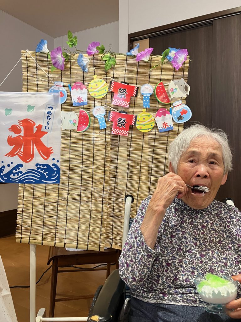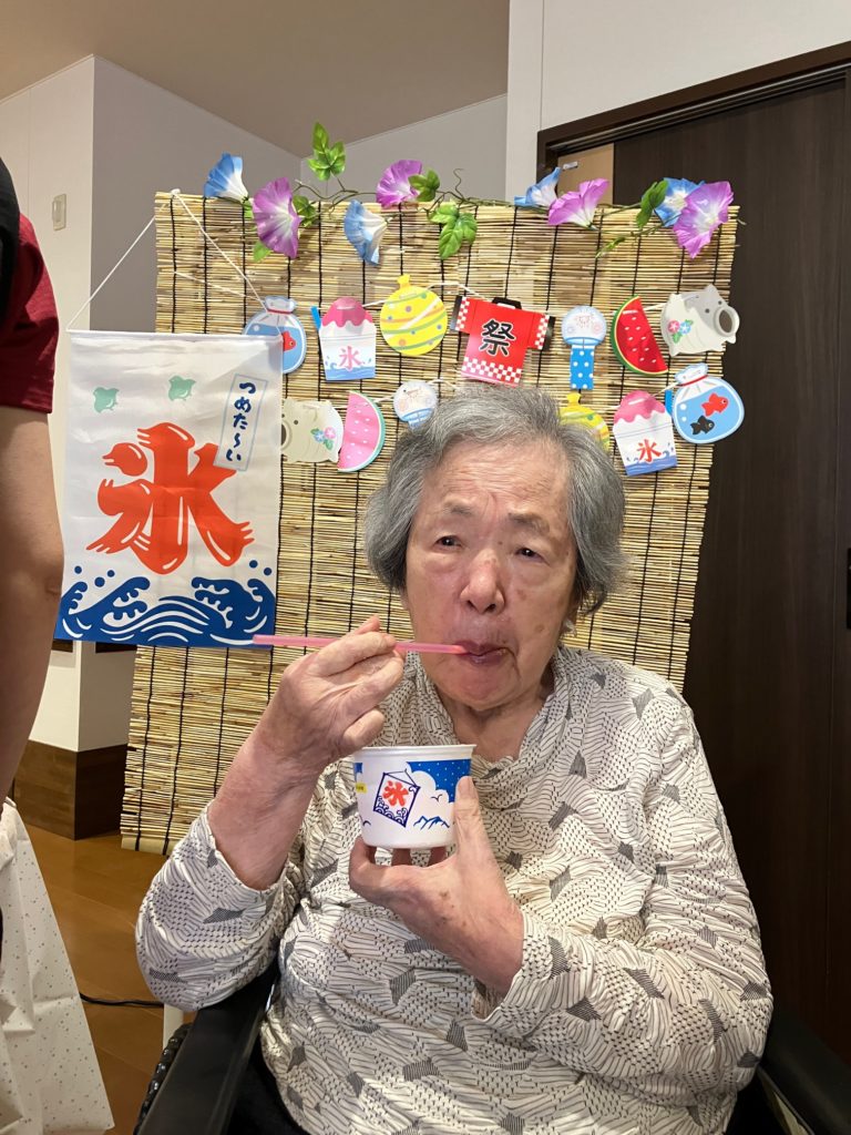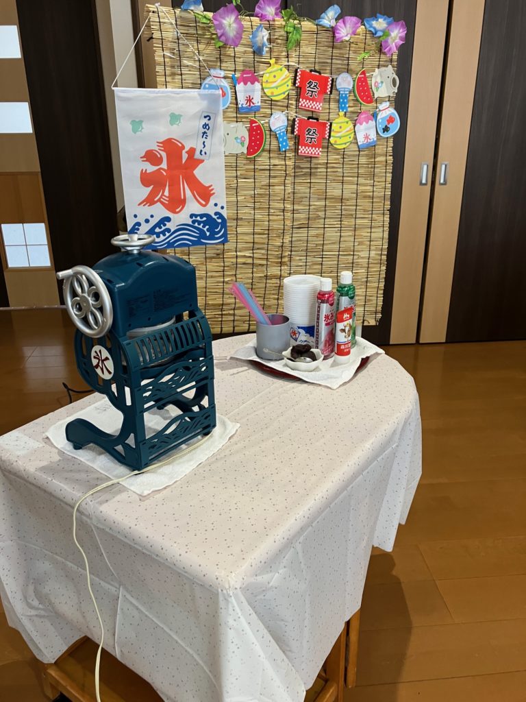 真夏になり、少しでも涼んで気分転換をしていただこうと思い、かき氷とムースの食レクを行いました!