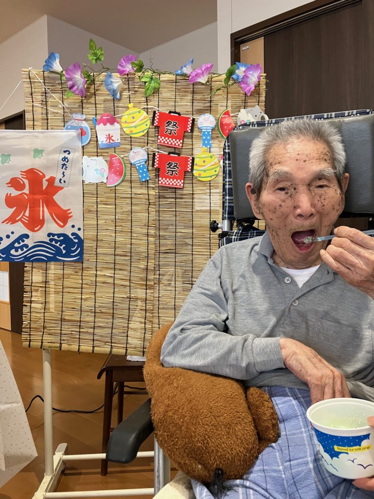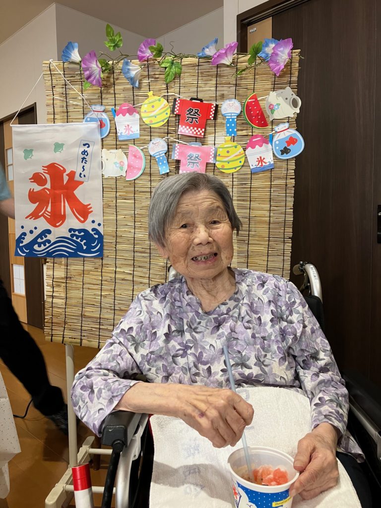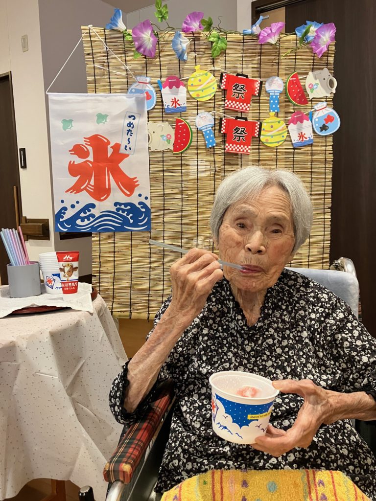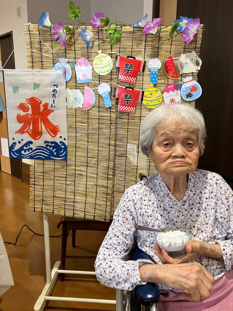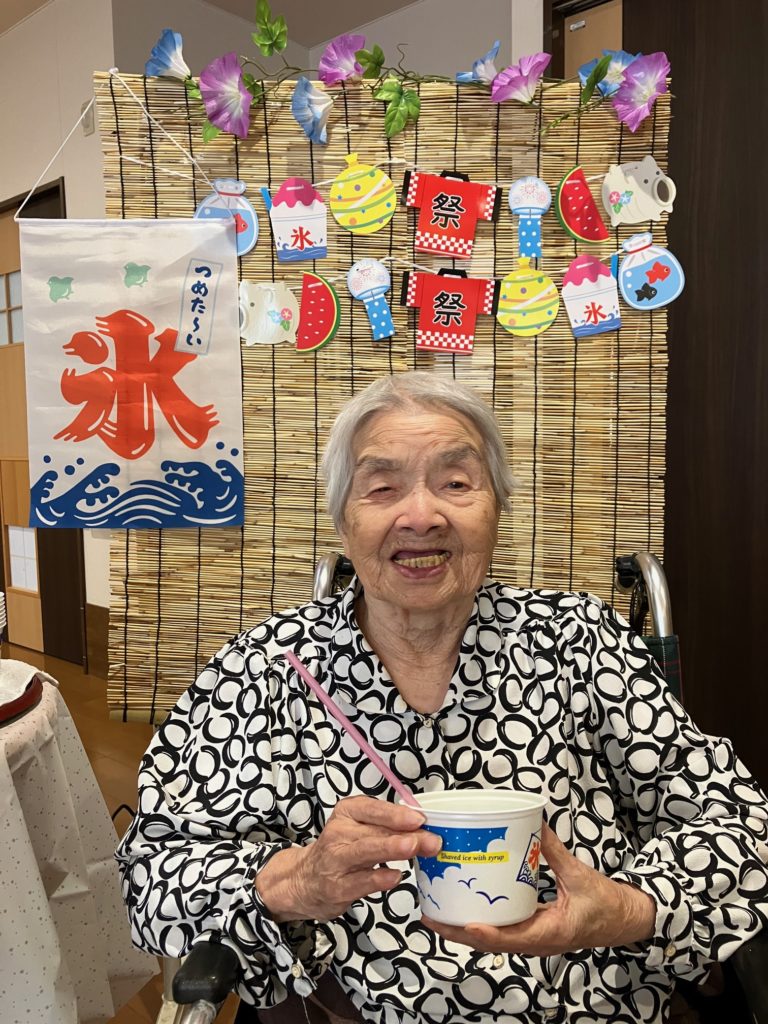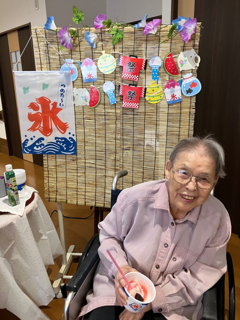 真夏になり、少しでも涼んで気分転換をしていただこうと思い、かき氷とムースの食レクを行いました!