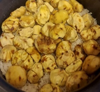 炊飯器に栗を入れて、炊飯へ