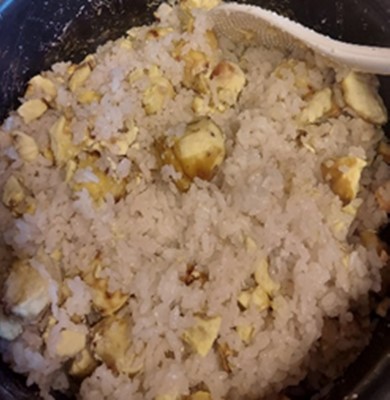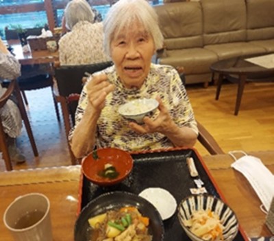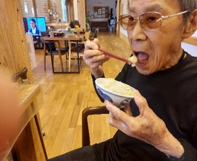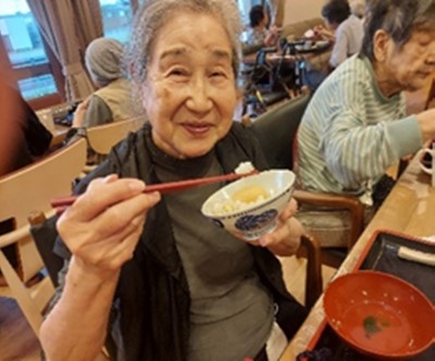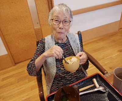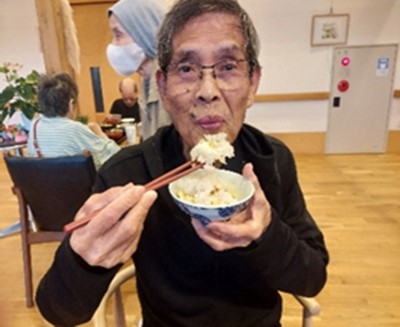 栗ご飯を持ってカメラに向かって素敵な笑顔!
