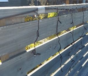 前日には、長い塀に、つららイルミネーションの設置です。
