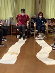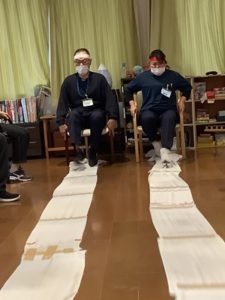 長くつなぎ合わせたタオルを足を使って手繰り寄せていきます。