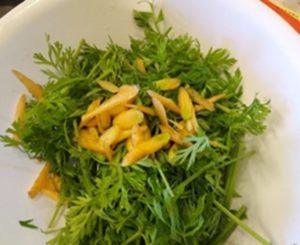 間引きした人参の葉っぱは、繊細で柔らかく色鮮やかです。