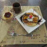 デコレーションする前のホットケーキを見て「わぁほどよう焼けとるね」と