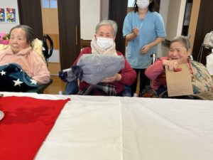 職員よりプレゼントを渡すと皆さん喜ばれ