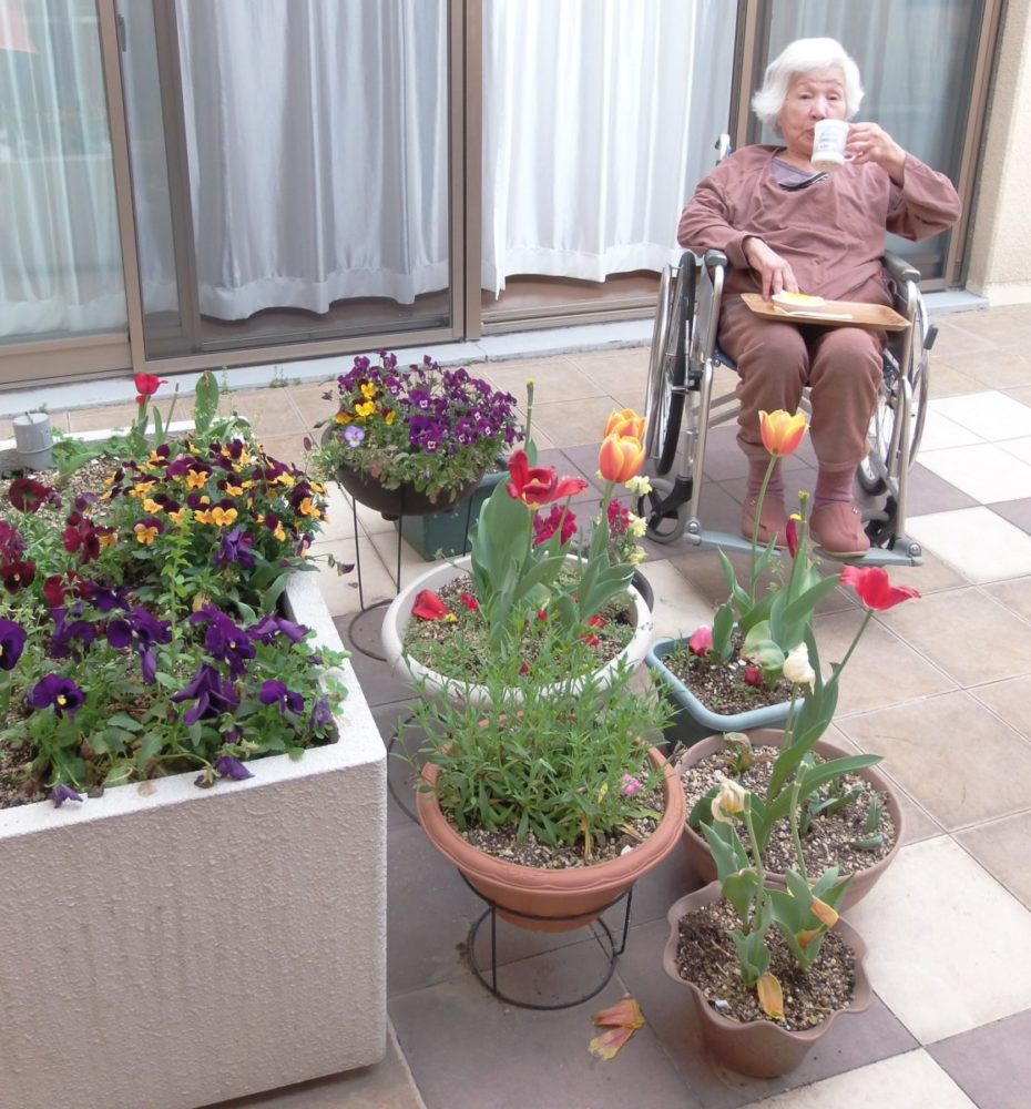 中庭にチューリップとビオラとパンジーの花がさきました。🌷