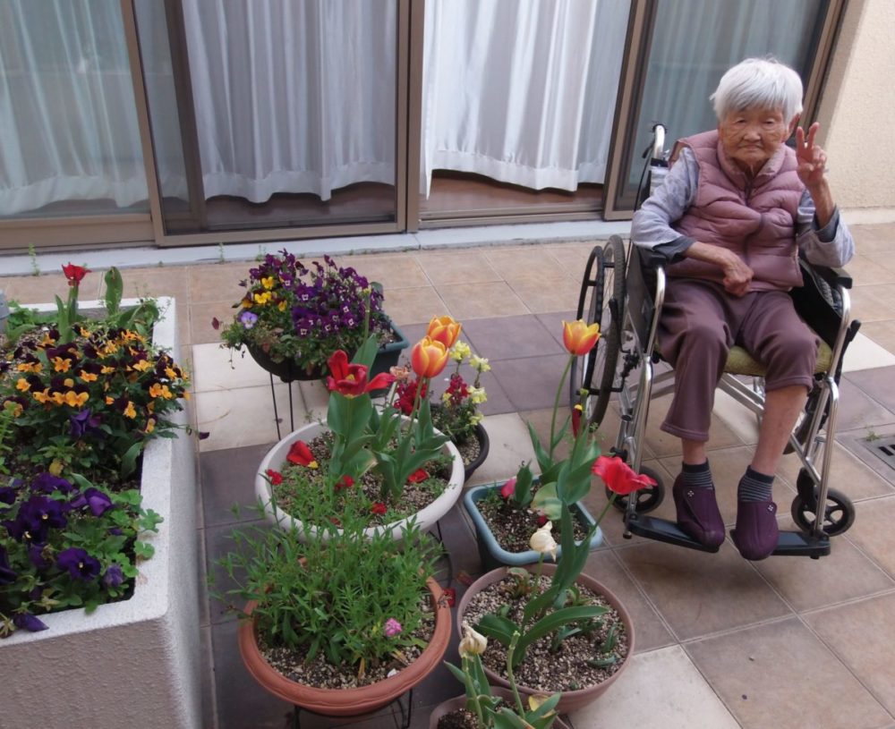 中庭にチューリップとビオラとパンジーの花がさきました。🌷