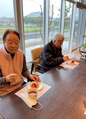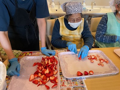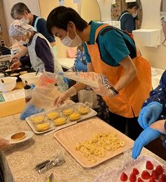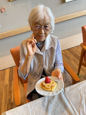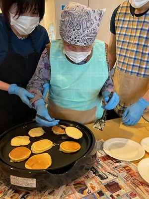 利用者様に、生地作り・フルーツカット・盛り付け・焼き作業を手伝っていただきました(^^)