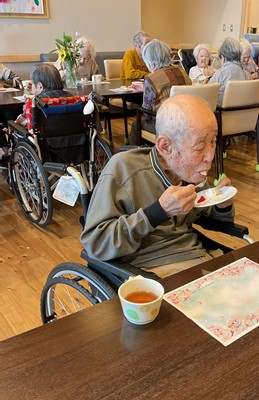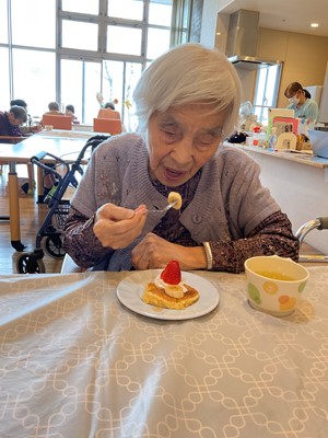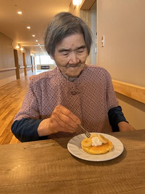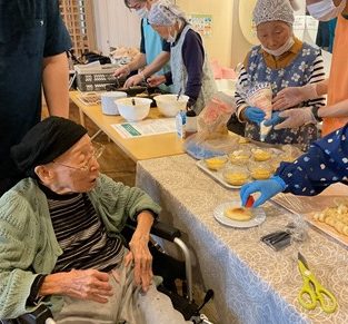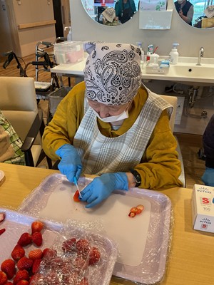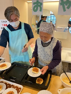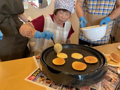 利用者様に、生地作り・フルーツカット・盛り付け・焼き作業を手伝っていただきました(^^)