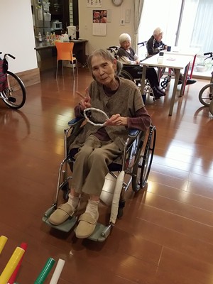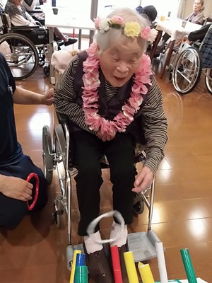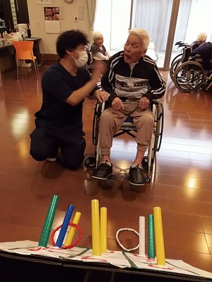 ゲームの輪投げ大会を開催。的に狙いを付けて一生懸命投げておられ、「あと少しだった」と