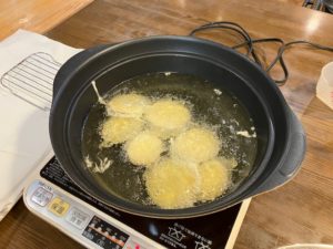 こちらは油も使いますので、皆様には見守って頂き職員で揚げていきます。
