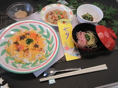 【献立:ちらし寿司、大豆と鶏の煮しめ、ほうれん草のピーナッツ和え、お吸い物(素麺)、七夕ゼリー】