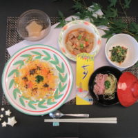 【献立:ちらし寿司、大豆と鶏の煮しめ、ほうれん草のピーナッツ和え、お吸い物(素麺)、七夕ゼリー】