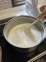 始めに、鍋に牛乳をいれて温め粉寒天を投入し沸騰させ粉寒天を溶かしたものに