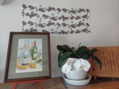 玄関は7月の絵画と、今年も咲いた胡蝶蘭の花です。