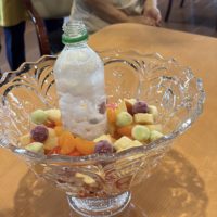 カットフルーツができたらガラス製の器に盛りつけていきます。