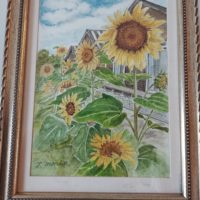 向日葵の絵とホオズキの色のコントラストが鮮やかです。