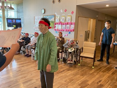 今回は体を使った種目の他にリハビリ職員の出し物があり、「おまつりマンボ」